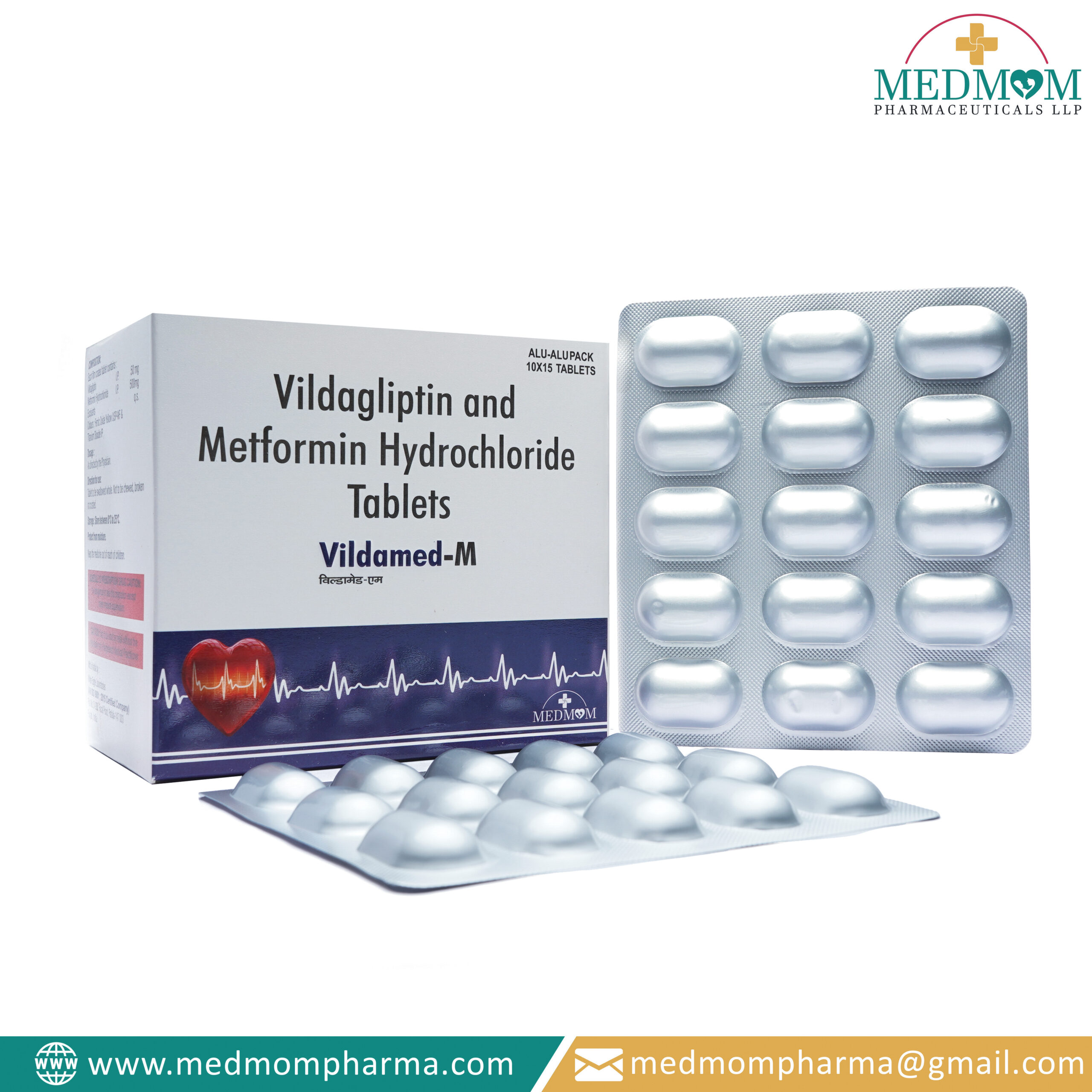 Vildagliptin 50 mg + Metformin 500 mg is employed for controlling type 2 diabetes by enhancing insulin sensitivity and lowering blood glucose levels. It makes the pancreas secrete more insulin and slows down sugar production by the liver. It regulates post-dinner sugar peaks and improves the overall control of glucose.